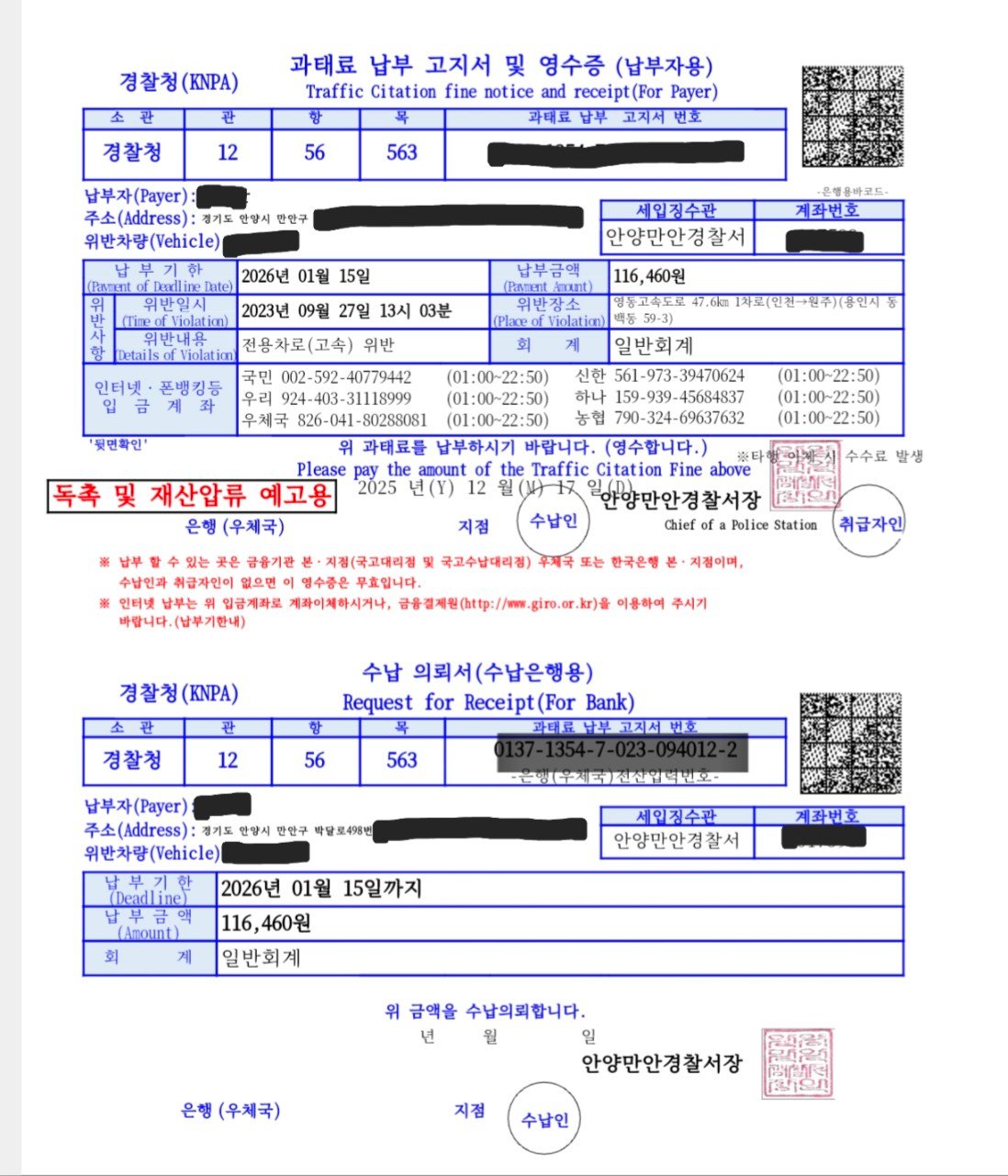 해당 사안은 시간이 흐른 뒤 다시 불거졌다. 최근 경찰청 명의로 2차 과태료 고지서가 발부되면서다. 당초 7만 원이던 과태료는 가산금이 붙어 11만 6400 원으로 늘어난 상태다.