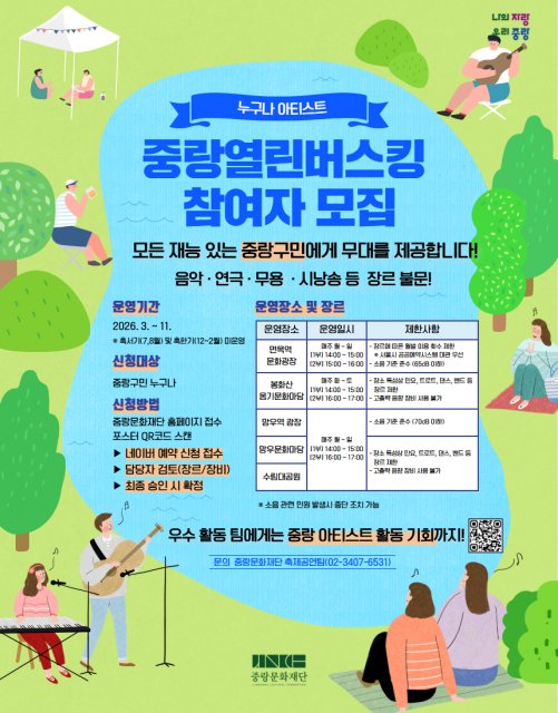 또한 중랑문화재단은 원활한 버스킹 운영과 지역 예술인들의 네트워크 구성을 위한 지원도 아끼지 않을 예정이다. 버스킹에 참여하는 예술인들에게는 자원봉사 활동 시간을 부여하고, 소통 네트워크(단톡방)를 운영해 자생적인 예술 생태계 조성을 돕는다. ‘중랑 열린 버스킹’은 구민 누구나 신청할 수 있으며, 네이버 예약을 통해 진행된다. 자세한 사항은 중랑문화재단 홈페이지에서 확인할 수 있다.