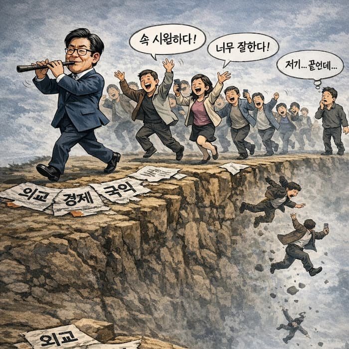 피리를 부는 정치인을 따라 환호하며 절벽으로 향하는 군중을 표현한 정치 풍자 만평, 외교 경제 국익 붕괴를 상징